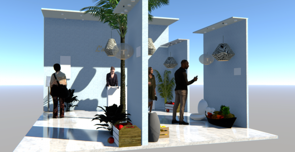 En öppen planlösning som gör att besökarna från olika håll enkelt kan besöka montern och skapa intresse för produkterna. Utifrån kundens önskemål har montern fått en stilren styling med dekorationsdetaljer som höjer stämningen och skapar en colombianskinspirerad atmosfär. Bananbåt fylld med frukter som är en stor transportmedel i Chocó där lamporna också har sitt ursprung. Vid kanterna av montern finnas broschyrer om lampornas ursprung och vad varje lampa har för betydelse. Vid varje vägg kan kunden välja att sätta upp små skyltar som ger information om varje lampa på så sätt har ni möjlighet att nå ut till information om produkterna till alla som besöker montern om personalen skulle vara upptagen med andra besökare.