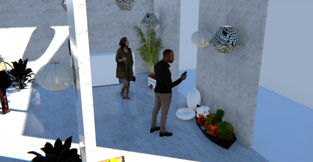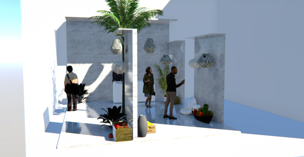 Med växter inspirerade från Colombias natur och krukor i jordnära färger förhöjs känslan av colombiansk atmosfär och vid varje vägg har varje lampa i kollektionen fått en platts för att visa på utbud. Genom att tända lamporna kan besökarna se hur lamporna lyser och själva kunna föreställa sig om hur det skulle kunna se ut om lampan befanns sig i deras hem. Vid dagarnas slut kan frukterna antingen säljas eller ge information till besökarna att det är tillåtet att ta med sig hem.